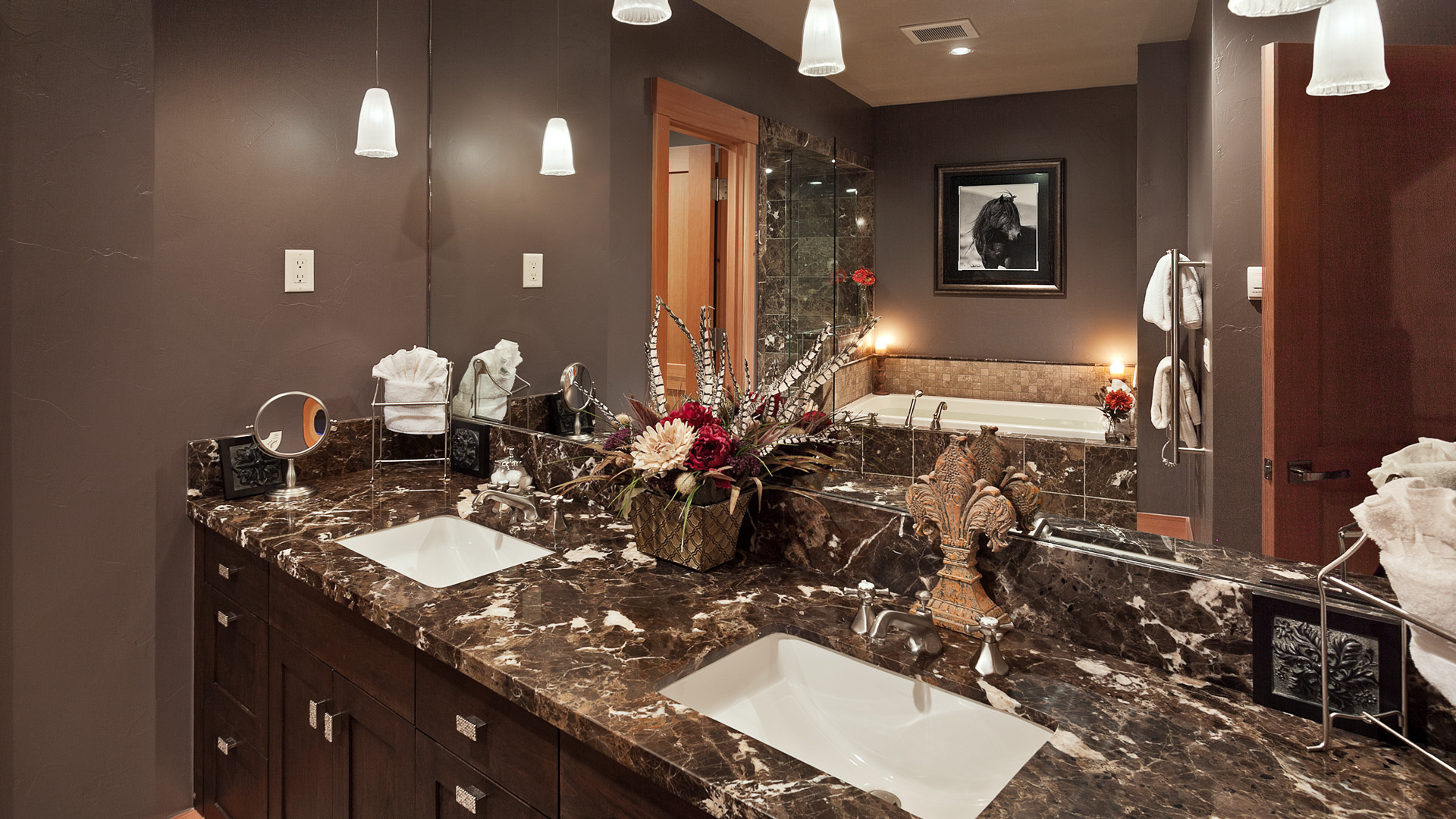 Beautiful gourmet kitchens boast custom cabinetry, granite countertops, large islands, and Wolf gas ranges, making entertaining fun and easy. Elegant dining areas seat 8-10 guests, with room for more at each of the kitchen bars.